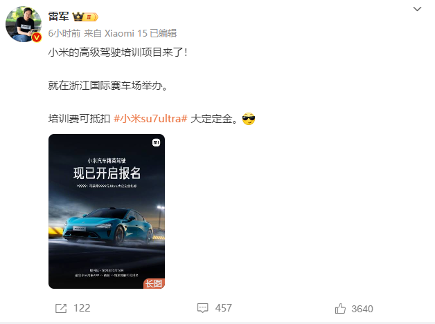 自小米SU7 Ultra发布以来,有关小米驾校的消息便不断引发公众关注。雷军在小米发布会上曾明确表示,将推出小米驾校,为大家提供高级驾驶培训、赛道驾驶培训以及漂移培训等课程,旨在帮助大家真正掌握驾驶技巧,享受驾驶的乐趣。