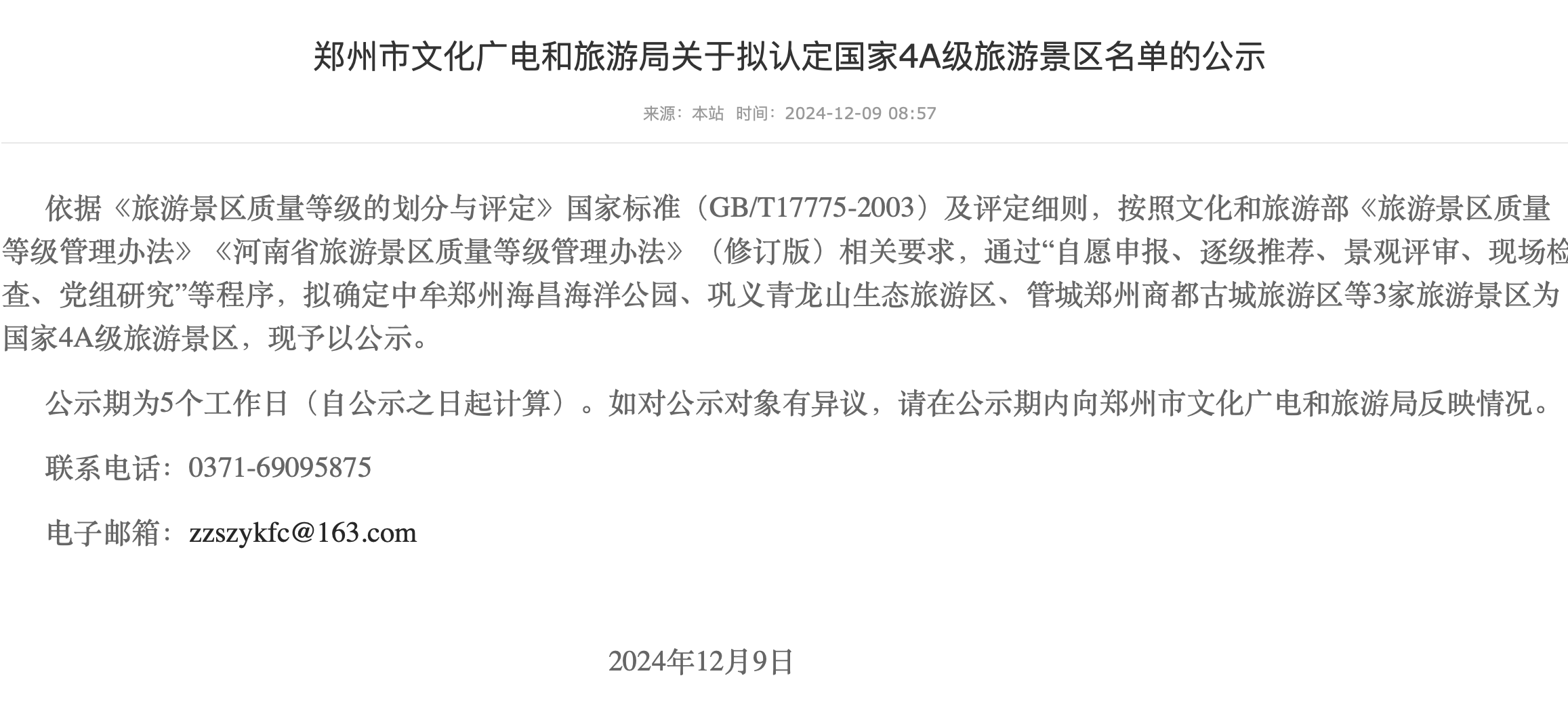 郑州市文化广电和旅游局公布,中牟郑州海昌海洋公园、巩义青龙山生态旅游区、管城郑州商都古城旅游区成功入选国家4A级旅游景区名单,公示期5个工作日。