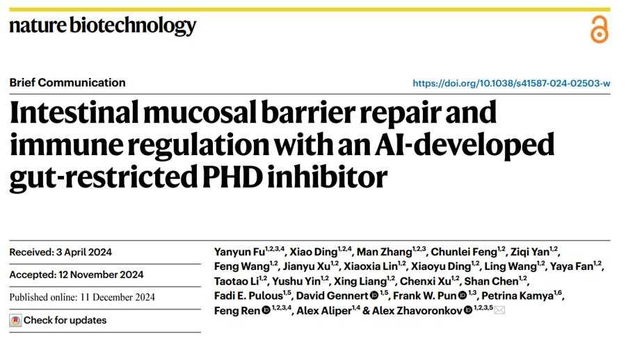 国际知名科技期刊《自然·生物技术》于近日刊登了英矽智能团队的论文,详细阐述了这家“人工智能+生物医药”企业在炎症性肠病(IBD)新药研发方面的最新进展。论文指出,研发团队利用AI综合生成化学引擎设计并优化的创新药ISM5411,已顺利完成Ⅰ期临床试验。该试验在中国和澳大利亚同步进行,有望为溃疡性结肠炎和克罗恩病患者提供新的治疗选择。
