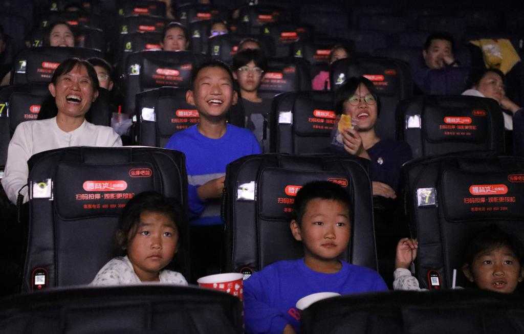 10月7日,在山东省博兴县的一家影城,观众们正沉浸在影片的精彩情节中。新华社发(陈彬摄)
