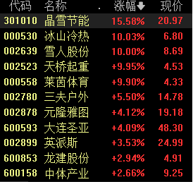 12月13日早盘,冰雪产业概念股异动拉升,冰山冷热、雪人股份、莱茵体育等个股纷纷涨停,三夫户外、大连圣亚、长白山、元隆雅图等个股紧随其后,呈现跟涨态势。