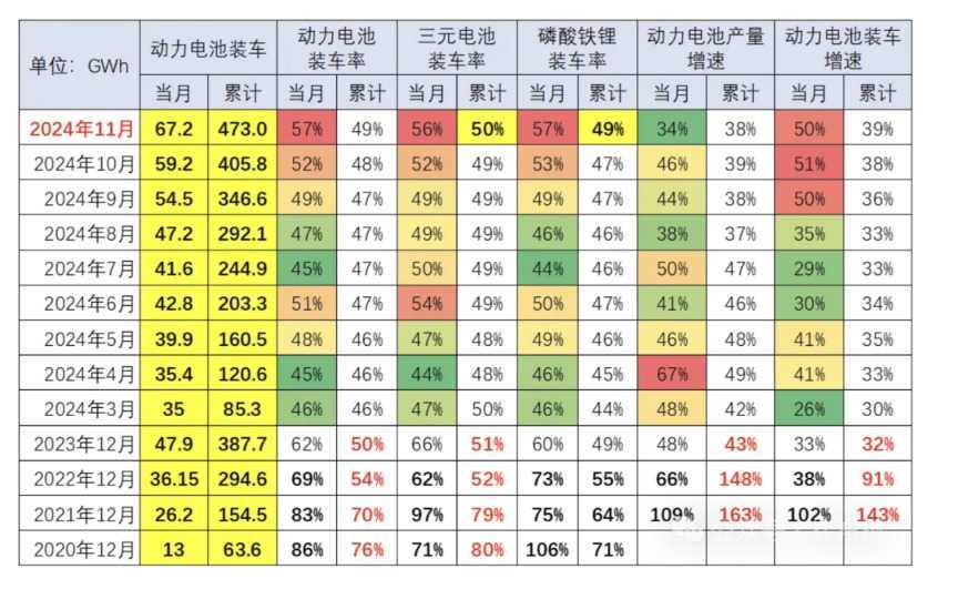 从1月至11月的累计数据来看,锂电池装车总量已经达到了473GWh,同比增长39%。这一数据进一步证明了新能源汽车市场的蓬勃发展以及锂电池需求的持续上升。