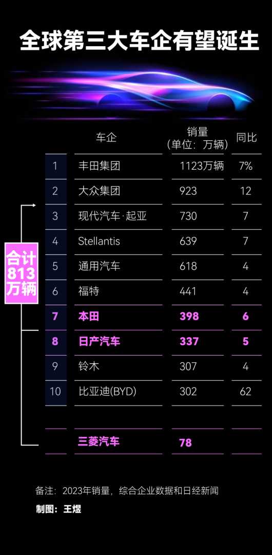 若此次并购成功,将成为自Stellantis成立以来汽车行业最大的并购案。本田、日产、三菱均为日本汽车行业的领军企业,2023财年,本田全球销量为398万辆,日产为337万辆,三菱为78万辆。面对特斯拉和中国电动汽车企业的挑战,三家日本车企计划集结技术力量等经营资源,力争成为世界第三大汽车制造商集团。