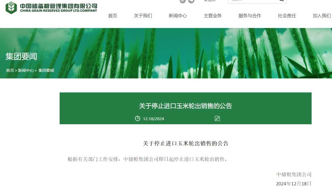 12月18日,中储粮集团公司发布公告称,即日起停止进口玉米轮出销售,此举旨在调整和优化国内玉米市场供应结构,引发市场广泛关注。