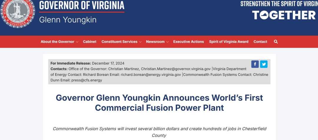 穆加德强调,这座工厂将是全球首座电网级别的核聚变发电厂,具有里程碑式的意义。弗吉尼亚州州长格伦·扬金对此表示热烈欢迎,认为这是“弗吉尼亚州乃至整个世界的历史性时刻”。
