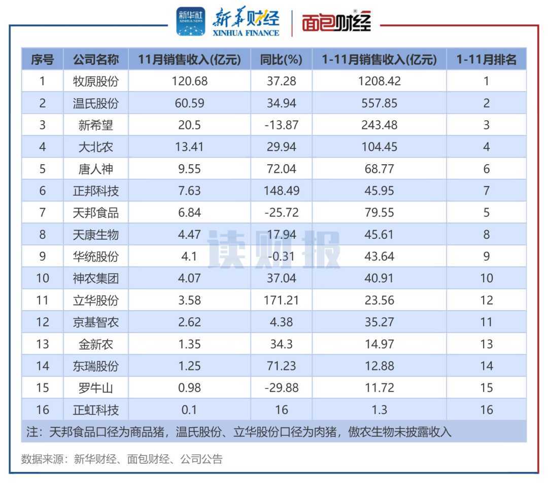 生猪养殖企业11月销售数据出炉:销量收入同比均上涨