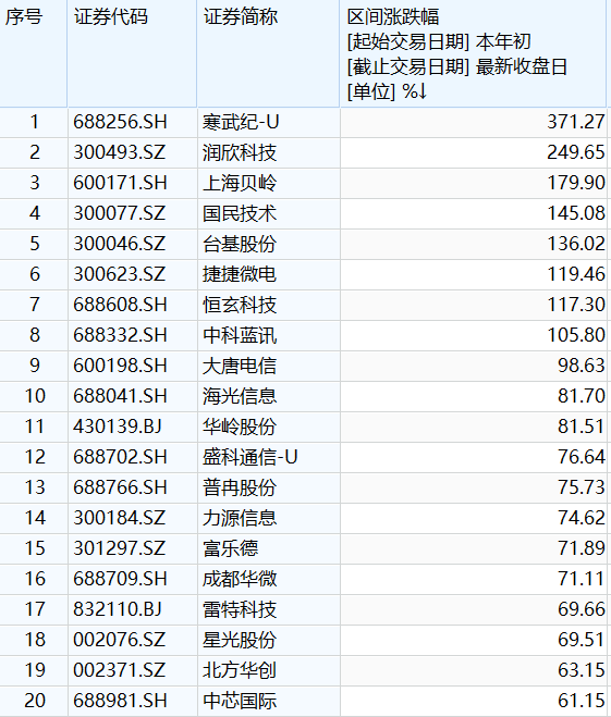 在个股方面,半导体板块表现同样抢眼。截至12月19日,半导体板块197只个股的总市值合计为4.83万亿元,年内累计增长1.08万亿元。其中,有70只半导体个股年内累计上涨逾20%,跑赢上证指数、沪深300等主要指数。特别是寒武纪、润欣科技、上海贝岭等龙头股涨幅更是遥遥领先,分别达到了371.26%、249.65%和180%。此外,中芯国际等龙头股也创下了历史新高。