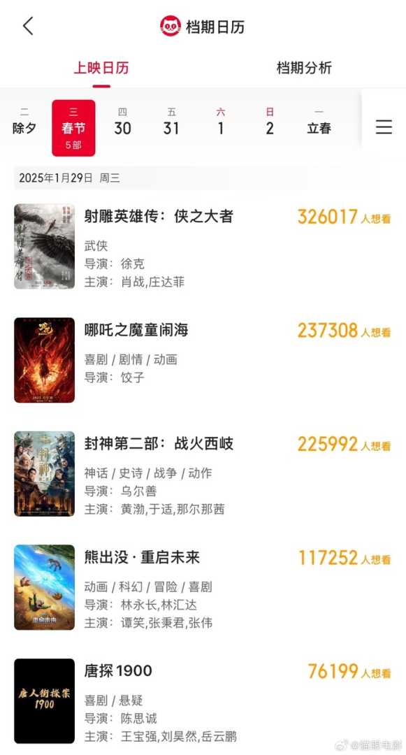 据@猫眼电影官方消息,备受瞩目的电影《唐探1900》正式宣布定档2025年春节档上映。根据猫眼专业版上映日历的最新显示,截至目前,已有五部影片锁定在2025年春节档这一黄金档期,除《唐探1900》外,还包括《哪吒之魔童闹海》《射雕英雄传:侠之大者》《封神第二部:战火西岐》以及《熊出没·重启未来》。这五部影片各具特色,涵盖了喜剧、动画、动作等多个类型,预计将为观众带来一场视听盛宴。