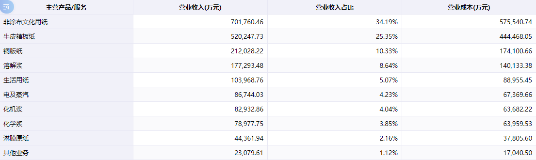 公开资料显示,太阳纸业主要从事机制纸、纸制品、木浆、纸板的生产和销售,业务范围覆盖产业用纸、生物质新材料、快速消费品三大部分。公司主要产品包括文化用纸(双胶纸、铜版纸)、包装用纸(牛皮箱板纸、瓦楞原纸)、快消类产品(生活用纸等)、特种纸、食品纸(淋膜原纸等)以及浆产品(溶解浆等)。根据2024年半年报,太阳纸业的非涂布文化用纸营收占比为34.19%。