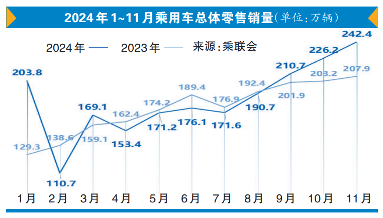 在中国汽车发展史上,2024年无疑是值得铭记的一年。7月,新能源汽车渗透率突破50%,提前达成国家目标;11月14日,中国新能源汽车年产量首破千万,位居全球之首。在“两新”政策推动下,11月乘用车产销突破300万辆大关。
