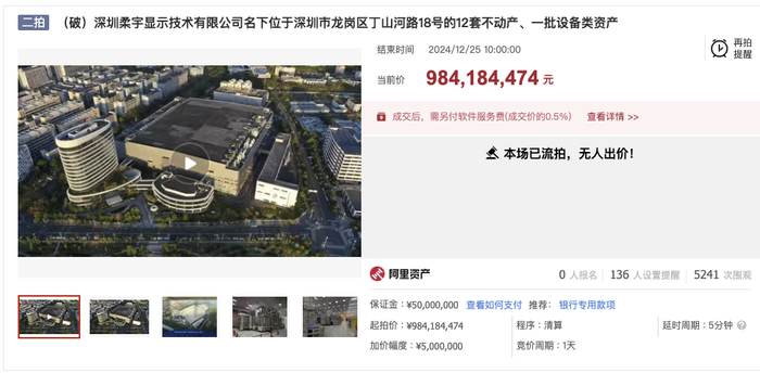 12月25日,根据阿里资产平台公布的信息,柔宇显示公司位于深圳市龙岗区丁山河路18号的12套不动产及一批重要设备资产,在今日的第二次拍卖中因缺乏买家竞价而再次流拍。本次拍卖的起拍价已从首次拍卖的12.30亿元大幅下调至约9.84亿元,但仍未能吸引买家参与。