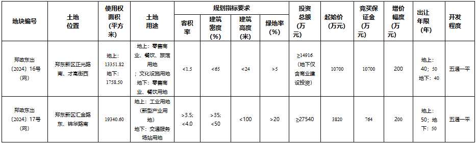 另一地块,郑政东出〔2024〕17号(网),则位于郑东新区汇金路东、锦华路南,使用权面积达到19340.60平方米。地上部分规划为新型产业用地,地下则作为交通服务场站用地,起始价为3820万元。