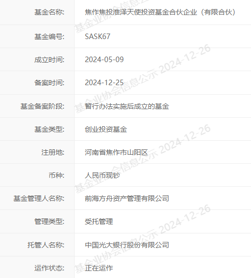 【大河财立方消息】12月26日,焦作焦投淮泽天使投资基金合伙企业(有限合伙)正式在中国证券投资基金业协会完成备案。
