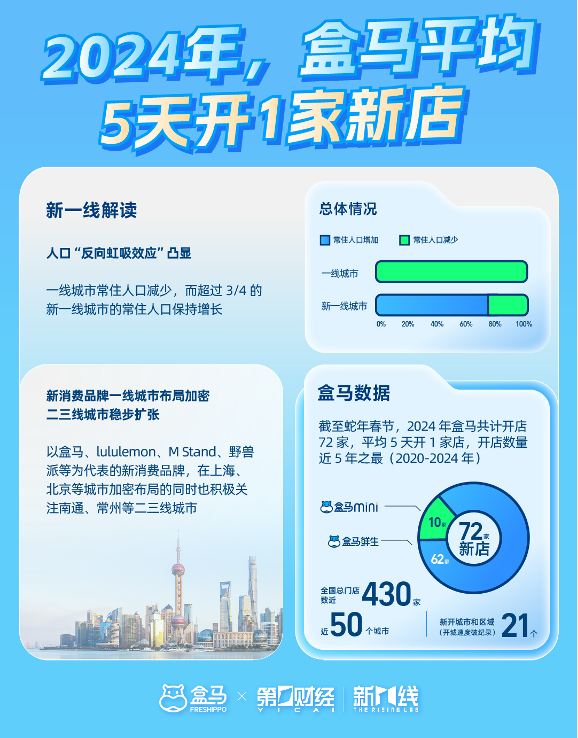 盒马与第一财经联合发布《2024盒区房消费趋势洞察报告》,显示盒马计划今年新开72家门店,全国门店总数近430家,平均5天开一家新店,反向虹吸效应显著,二三线城市成发展重点。