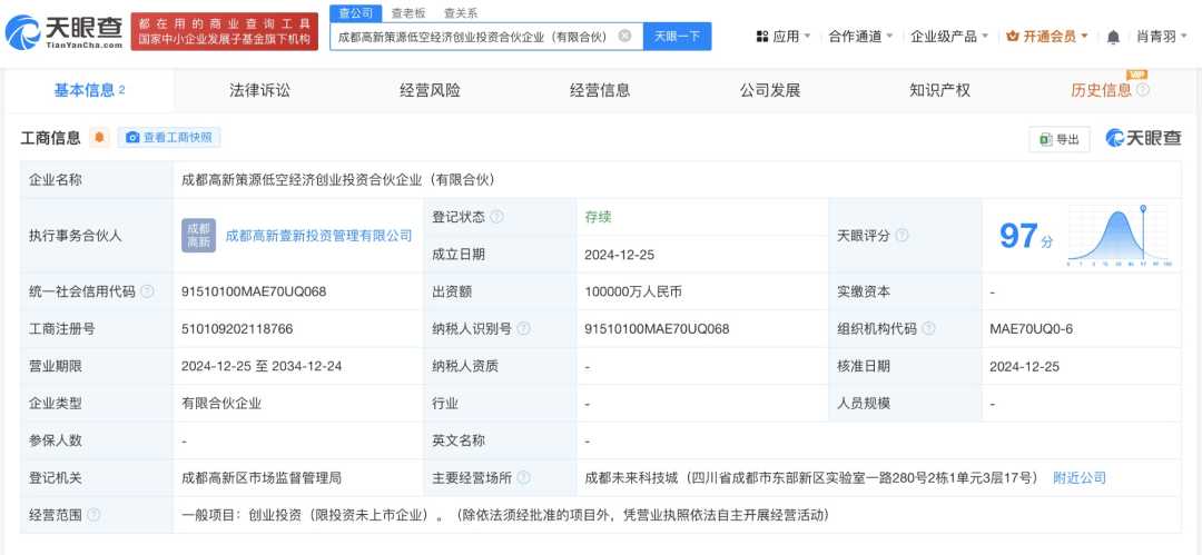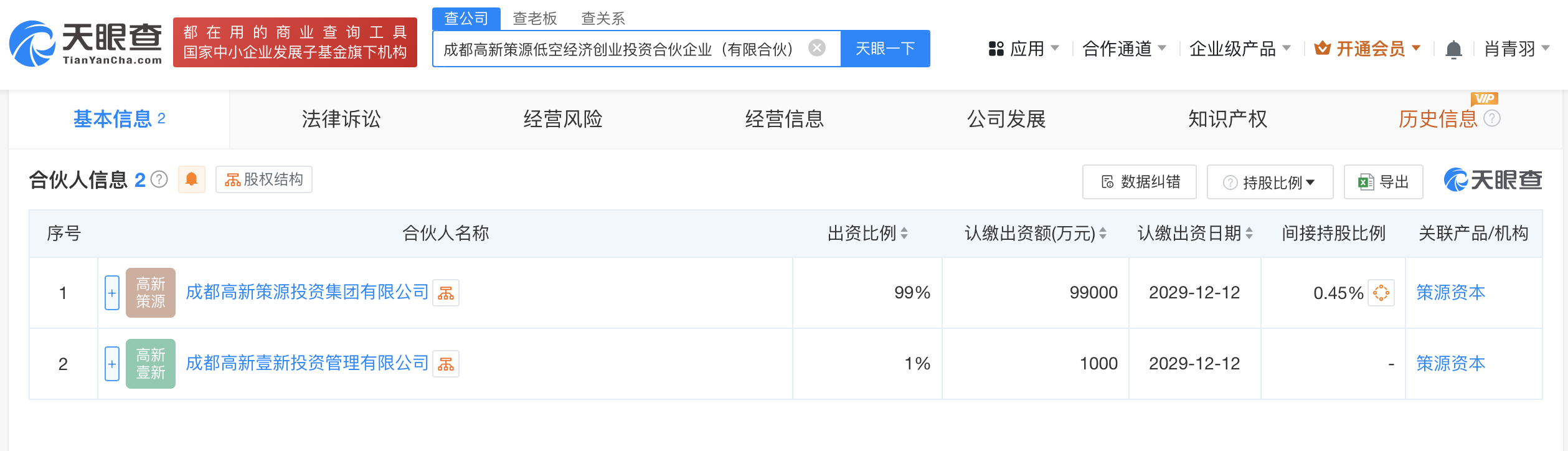 该合伙企业由两大实力雄厚的股东共同出资设立,分别是成都高新策源投资集团有限公司与成都高新壹新投资管理有限公司。此次合作不仅彰显了双方在低空经济领域的深度布局与战略眼光,也预示着未来在低空经济领域的创业投资将迎来新的发展机遇。