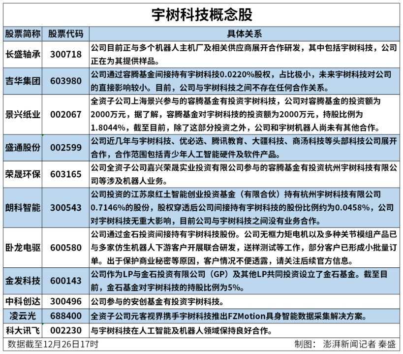 据不完全统计,近期共有11家上市公司提及间接持股宇树科技或与之有合作关系。然而,吉华集团在12月26日发布的股票交易异常波动公告中澄清,公司仅通过容腾基金间接持有宇树科技0.02%股权,占比极小,未来对公司的直接影响较小,且目前与宇树科技之间不存在任何合作关系。此前,朗科智能(300543)等公司也提示与宇树科技没有业务合作,警示风险。