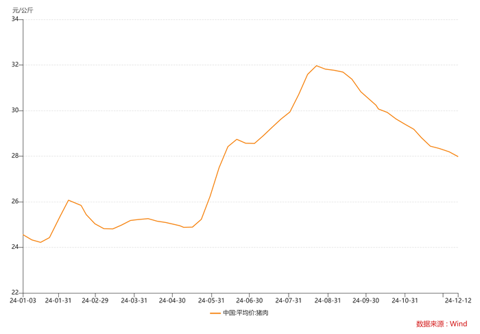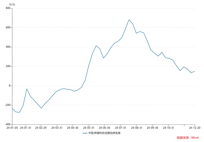 截至12月12日,猪肉平均价格已涨至27.98元/千克,相较2023年末上涨13%。自2024年5月开始,自繁自养生猪开启盈利时刻,年度最高盈利高达682元/头。前三季度生猪板块实现归母净利润205亿元,同比扭亏401亿元。第三季度行业资产负债率下降至62%,资金压力也有所缓解。