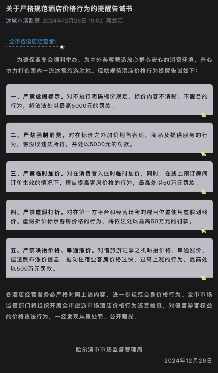 哈尔滨哈西万达广场前的“冰封玫瑰”成为新网红,吸引了《玫瑰的故事》主演刘亦菲的关注。此外,老虎、驯鹿、企鹅等经典项目再次亮相,获得游客一致好评。哈尔滨市市场监督管理局发布告诫书,严格规范酒店价格行为,严防哄抬价格。