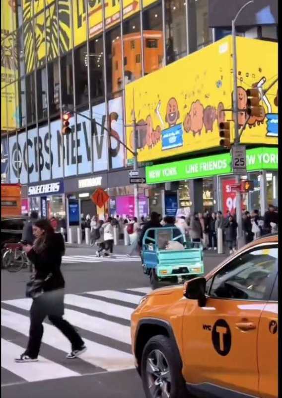 三蹦子穿梭在纽约时代广场车流中,视频截图