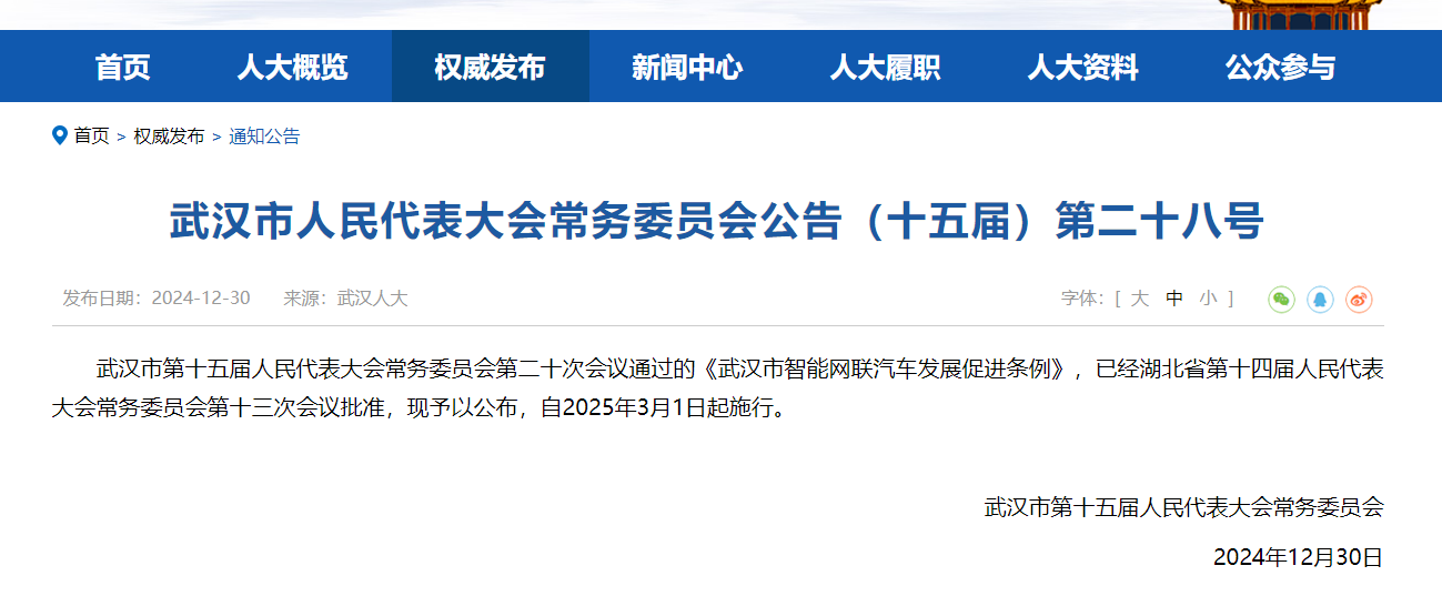 12月30日,武汉市人大常委会正式发布了《武汉市智能网联汽车发展促进条例》,该条例由武汉市第十五届人民代表大会常务委员会第二十次会议通过,并经湖北省第十四届人民代表大会常务委员会第十三次会议批准,将于2025年3月1日起正式施行。这一条例的出台,标志着武汉市在智能网联汽车领域的发展迈出了重要一步。