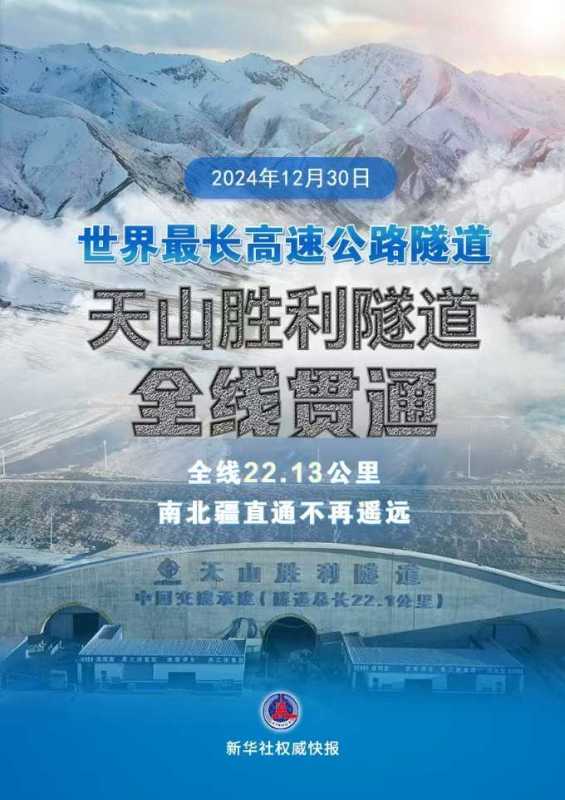 12月30日,新疆天山胜利隧道全线贯通,全长22.13公里,是世界最长的高速公路隧道。乌尉高速公路预计2025年全线通车,届时乌鲁木齐至库尔勒车程将缩短至3个多小时。