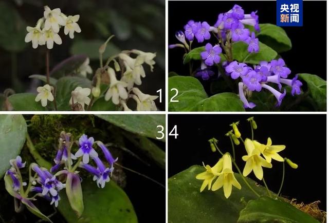 图中展示的是部分新发现的植物分类群,依次为:(1)黄鹦报春苣苔、(2)华丽报春苣苔、(3)盛宇报春苣苔、(4)金翅报春苣苔。
