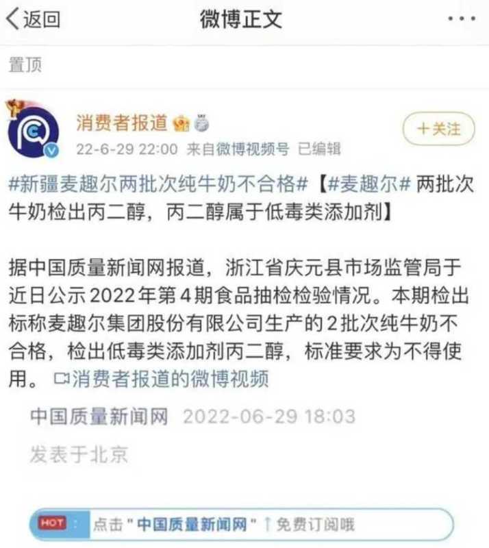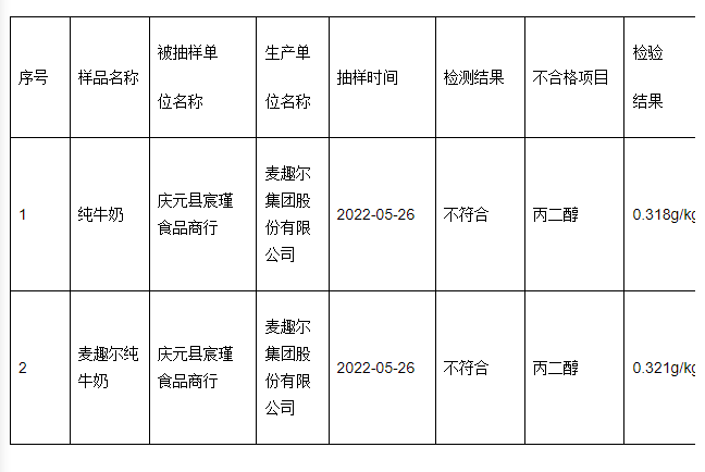 据@消费者报道,浙江省庆元县市场监管局公示的2022年第4期食品抽检结果显示,麦趣尔集团股份有限公司生产的两批次纯牛奶被检出含有丙二醇,这是一种低毒类添加剂。