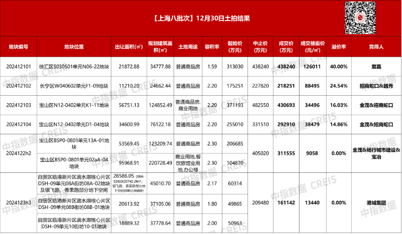 12月30日,上海今年第八批次土拍活动圆满落幕,共推出7幅地块,覆盖宝山区、徐汇区、长宁区、奉贤区及自贸区临港新片区等关键区域。首日交易中,6幅地块全部顺利成交,其中徐汇区S030501单元N06-22地块成为全场焦点。民企宸嘉发展以43.824亿元高价、40%的溢价率成功竞得此地块,其在“高品质建设”竞报环节中的卓越表现尤为亮眼。