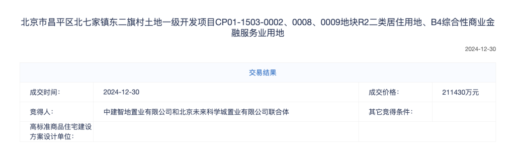 北京昌平区北七家镇一宗涉宅用地正式出让,由中建智地置业有限公司和北京未来科学城置业有限公司联合体竞得,成交楼面价21057元/平方米,溢价率0.31%。