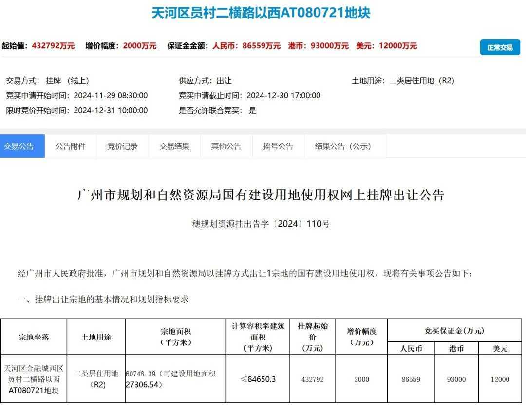 据出让公告显示,天河区金融城西区员村二横路以西的AT080720、AT080721地块均为二类居住用地,面积分别为15064.88平方米和60748.39平方米,起始价分别为269393万元和432792万元。竞得人需按要求配建幼儿园和小学,并无偿移交给天河区人民政府。