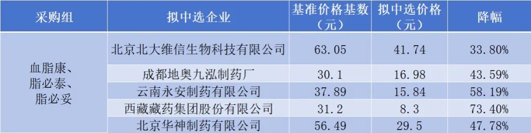 此外,第三批中成药集采还纳入了多个独家品种和国家中药保护品种,如灯盏花素滴丸和血栓通胶囊等。这些品种的价格降幅相对较小,但仍在一定程度上体现了集采的降价效果。例如,血脂康、脂必泰、脂必妥(口服)采购组中,北京北大维信生物科技有限公司的血脂康胶囊(片)的降幅为33.8%,低于采购组内其他产品。