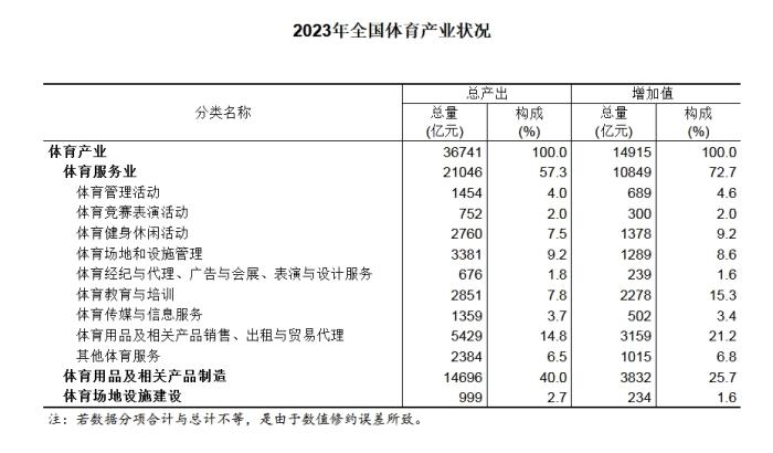 2023年我国体育产业总规模达36741亿元,增加值占GDP比重为1.15%,体育服务业成为核心组成部分,体育用品制造领域保持稳定,体育场地设施建设为产业提供坚实基础。