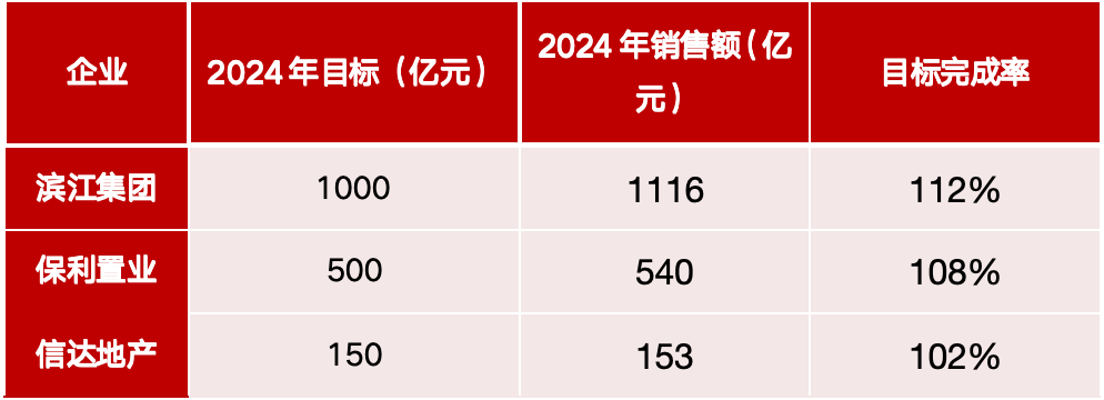 在房企销售目标方面,滨江集团、保利置业、信达地产三家房企超额完成了2024年的销售目标。其中,滨江集团实现销售金额1116亿元,目标完成率达到112%;保利置业以540亿元完成了108%的销售目标;信达地产销售额153亿元,目标完成率102%。这些房企通过精准的市场定位和有效的销售策略,成功应对了市场变化。