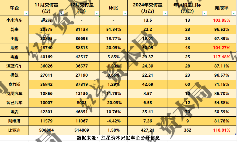 比亚迪、零跑汽车、小米汽车和理想汽车成功超越了2024年的销售目标;蔚来与极氪的完成率超过90%;深蓝汽车、岚图汽车与阿维塔的完成率也超过了80%。