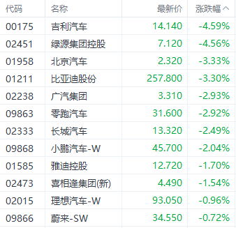 截至发稿,吉利汽车(00175.HK)、北京汽车(01958.HK)、比亚迪股份(01211.HK)、广汽集团(02238.HK)、零跑汽车(09863.HK)等车企的股票价格分别下跌4.59%、3.33%、3.30%、2.92%。