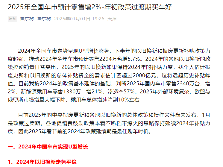 对于2025年的车市前景,中国汽车流通协会乘用车市场信息联席分会的秘书长崔东树表示,2024年中国汽车市场经历了U型增长,市场零售量预计将达到2294万台,同比增长5.7%。他预计,如果2025年继续实施类似的补贴政策,报废更新和以旧换新的补贴资金需求可能会超过2000亿元。基于2024年政策的延续,预计2025年中国车市零售量将达到2340万台,同比增长2%,其中新能源乘用车零售量预计为1330万台,同比增长21%,市场渗透率达到57%。然而,他也指出,2025年的全球市场环境预计将较为复杂,欧盟和俄罗斯市场的增长预计将大幅放缓,全球乘用车市场的增速可能降至10%左右。