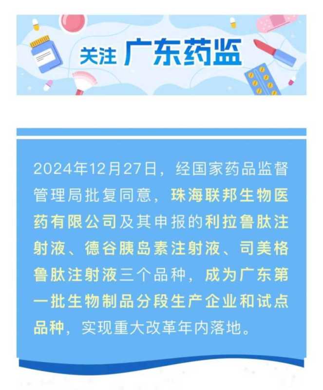 广东省药监局官方微信公众号“广东药监”近日发布了一则重要消息:珠海联邦生物医药有限公司及其申报的利拉鲁肽注射液、德谷胰岛素注射液、司美格鲁肽注射液三个品种,经过国家药品监督管理局的正式批复,成为广东首批生物制品分段生产企业和试点品种,标志着这一重大改革将在年内正式落地实施。