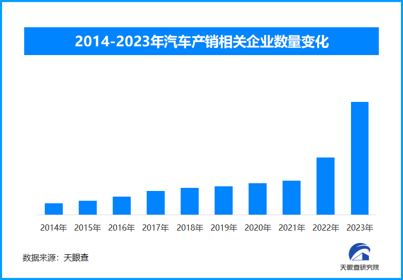 此外,天眼查专业版数据显示,目前我国现存且处于在业、存续状态的汽车产销相关企业已超过141.9万家。其中,2024年截至目前新增注册相关企业约31.1万余家。从注册数量趋势来看,近十年来,汽车产销相关企业的注册数量总体呈现出稳步增长态势,特别是在2023年,出现了爆发式增长,环比增长高达97.6%。