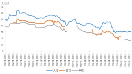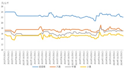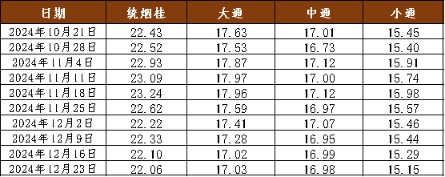 分品种来看,统烟桂的批发价格略有下跌,截至2024年12月23日,价格为22.06元/公斤,较前一周下跌0.04元/公斤,跌幅为0.18%。大通肉桂的批发价格则略有上涨,价格为17.03元/公斤,涨幅为0.06%。中通肉桂和小通肉桂的批发价格则分别下跌了0.01元/公斤和0.14元/公斤,跌幅分别为0.06%和0.92%。