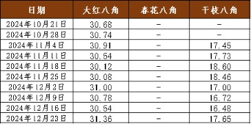 具体来看,大红八角的批发价格表现出色,截至2024年12月23日,价格达到31.36元/公斤,较前一周上涨0.82元/公斤,涨幅为2.69%。同时,干枝八角的批发价格也呈现上涨趋势,价格为17.65元/公斤,较前一周上涨1.17元/公斤,涨幅达到7.09%。
