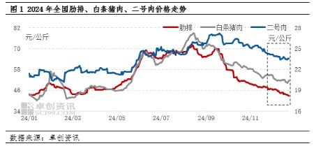 具体来看,截至2024年12月25日,全国鲜品二号肉成交均价降至23.58元/公斤,鲜品白条猪肉成交均价降至20.43元/公斤,而鲜品肋排均价则跌至42.83元/公斤。尽管白条肉和二号肉价格在12月有所反弹,但肋排价格却持续震荡下行。