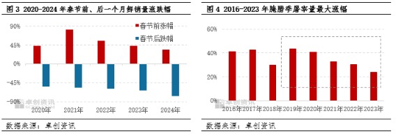 此外,受低价牛肉、禽肉等替代品的影响,肋排供应的增长速度超过了需求,加之原料成本下降,导致肋排价格震荡下行。从近年来春节前后鲜销量的涨跌幅度来看,春节前鲜销量的涨幅逐渐收窄,而节后鲜销量的跌幅则震荡增加。这反映出春节对终端猪肉采买需求的提振力度正在减弱。