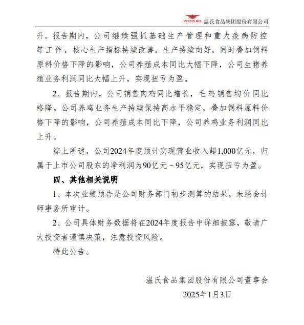 温氏股份2024年度业绩预告:净利润预计达90-95亿