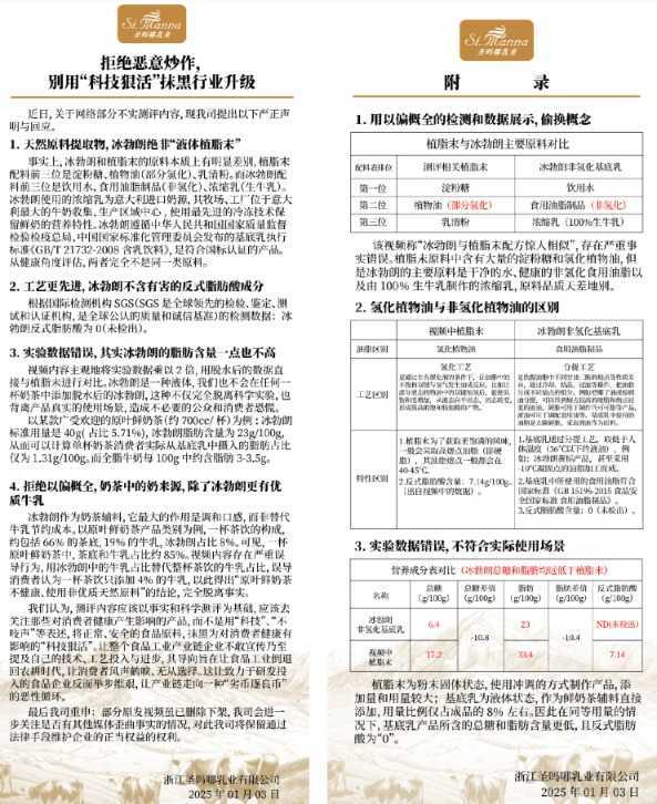 对此,1月3日,“冰勃朗”的头部企业浙江圣吗哪乳业有限公司迅速作出回应,发布了一份名为《拒绝恶意炒作,别用“科技狠活”抹黑行业升级》的声明。声明中,圣吗哪乳业坚决否认“冰勃朗”是“液体植脂末”,并从原料、健康及工艺等多个角度进行了详细解释。圣吗哪乳业指出,测评视频存在偏概全、误导消费者、实验数据错误以及不符合实际使用场景等问题。