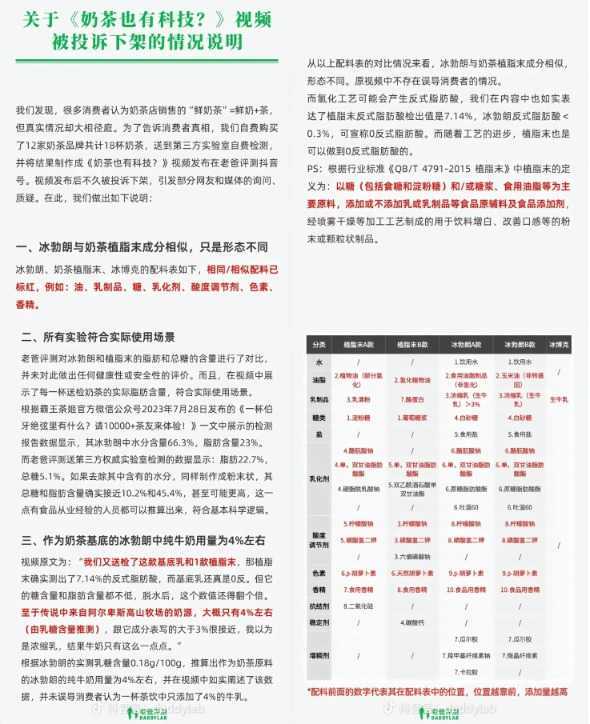 “老爸评测”在回应中强调,原视频中不存在误导消费者的情况,并详细解释了“冰勃朗”与奶茶植脂末的成分相似但形态不同,以及所有实验均符合实际使用场景等事实。同时,“老爸评测”也指出,作为奶茶基底的“冰勃朗”中纯牛奶用量为4%左右,并未误导消费者认为一杯茶饮中只添加了4%的牛乳。
