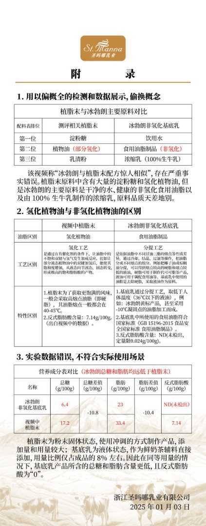圣吗哪还表示,原视频中的评测内容以偏概全,采用了错误的实验数据,对消费者产生了巨大的误导,并用“科技狠活”等表述抹黑了正常、安全的食品原料。为了证明其观点,圣吗哪提供了相关数据对比:100g植脂末中测出的总糖、脂肪含量分别为17.2g、33.4g,并含有7.14g反式脂肪酸;而相同规格的冰勃朗非氢化基底乳测出的结果则分别为6.4g、23g,且未检出反式脂肪酸。