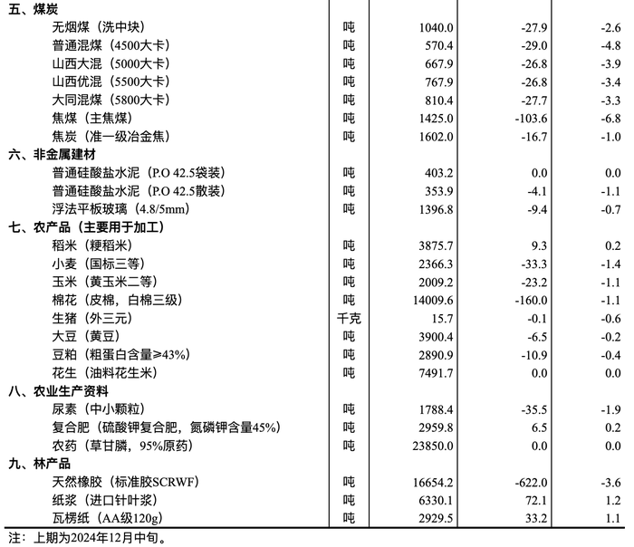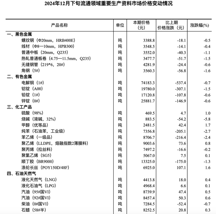 国家统计局发布最新生产资料市场价格监测数据,显示2024年12月下旬与中旬相比,14种产品价格上涨,33种下降,生猪价格下降0.6%。