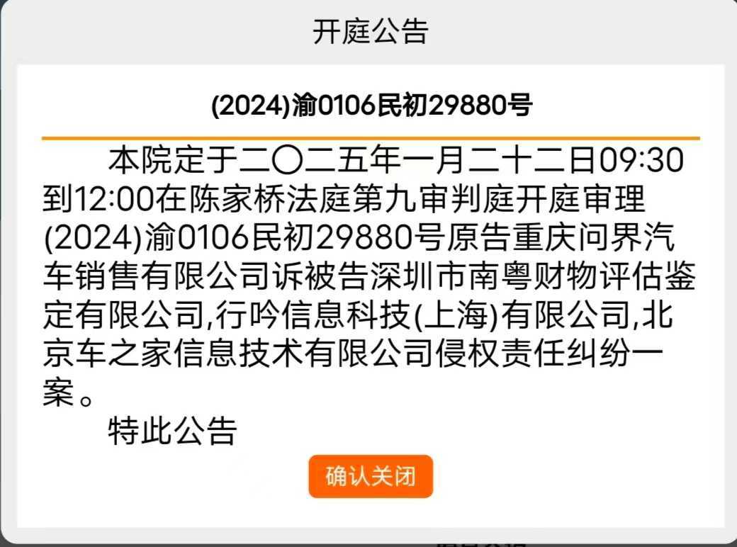 1月4日,中国证券报·中证金牛座记者从可靠渠道获悉,重庆问界汽车销售有限公司已就侵权责任纠纷向深圳市南粤财物评估鉴定有限公司、行吟信息科技(上海)有限公司及北京车之家信息技术有限公司提起诉讼,该案将于1月22日在重庆市沙坪坝区人民法院正式开庭审理。