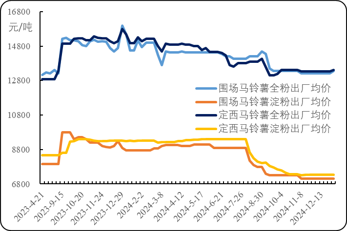 进口价格稳步上扬带动围场乃至全国初级薯制品出厂价格开始波动上涨。截至2025年1月3日,围场马铃薯淀粉出厂均价为7100.00元/吨,环比持平,同比下跌18.86%;围场马铃薯全粉出厂均价为13357.14元/吨,环比上涨1.08%,同比下跌13.68%。