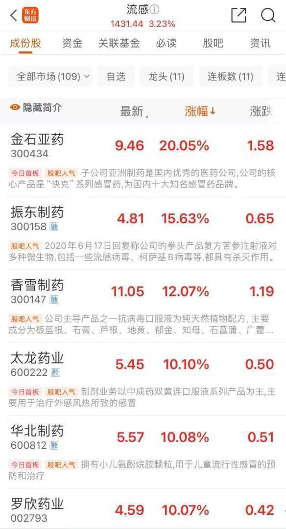 1月6日下午,抗流感概念午后涨势显著增强,太龙药业与以岭药业在午后交易中共同达到涨停,同时,罗欣药业、华北制药、亚太药业、金石亚药等超过十只成分股也相继涨停。